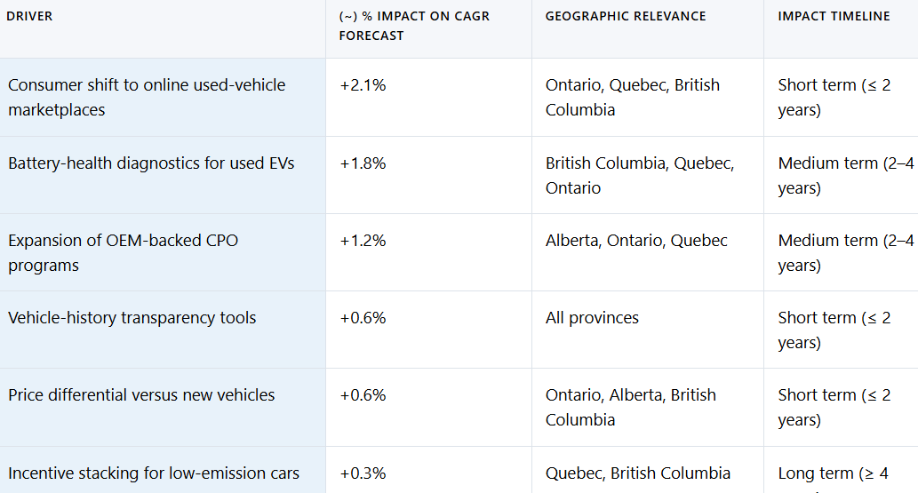 The federal 2035 ZEV sales mandate will magnify regional disparities in used-EV supply. Early-adopter provinces amass deeper secondary-market inventories, giving them a head start in battery-health-service ecosystems. Cross-border arbitrage remains limited because residency proof is required to claim provincial rebates, although some consumers exploit relocation loopholes. Harmonization of digital transfer protocols is progressing, but varying tax rates and lien documentation standards still complicate multi-province transactions. Over the forecast horizon, infrastructure rollout and policy alignment are expected to narrow these regional gaps.