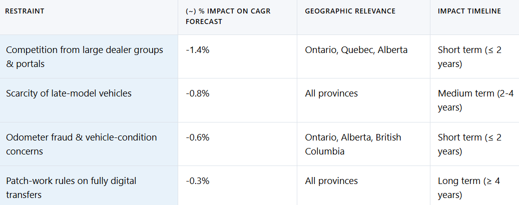 M&A activity likely continues as global classifieds groups seek North American exposure and domestic dealers acquire specialized independents to access inventory niches. Regulatory momentum toward disclosure standardization favors well-capitalized incumbents that can absorb compliance costs, suggesting gradual consolidation but not outright dominance due to Canada’s vast geography and provincial diversity.