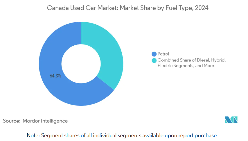 Petrol vehicles made up 64.27% of transactions in 2024 and will remain the backbone of the Canadian used car market for the next five years, reflecting nationwide fueling infrastructure and resale familiarity. Yet electric vehicles are forecast to register a 20.4% CAGR through 2030, aided by overlapping federal and provincial incentives and falling battery-replacement costs. Hybrid models provide an intermediate step for households lacking home charging access, sustaining residuals in urban centers. Diesel demand declines quickly under stricter emissions rules and downtown restrictions, prompting significant value erosion in older pickups and cargo vans.
