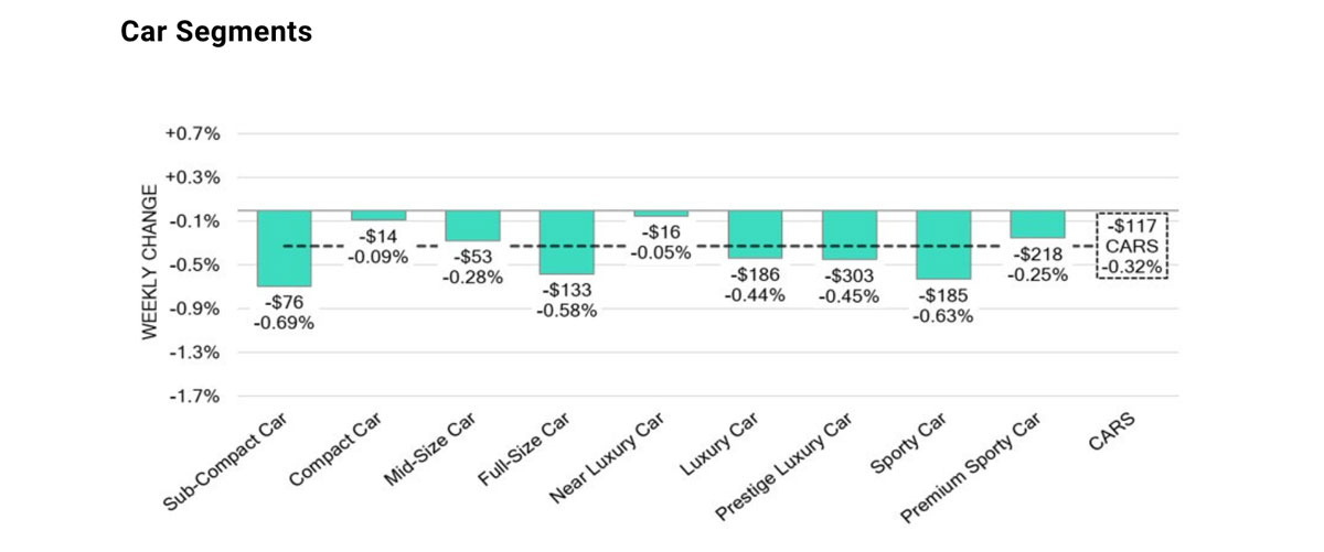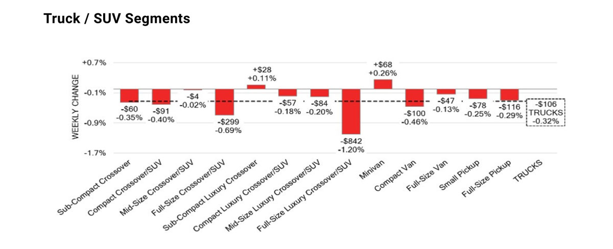 Both car segment prices and trucks/SUVs segment prices decreased by the same amount: -0.32%. Cars were down -0.06% the prior week, while trucks/SUVs were down -0.29%. The only positive segments overall were minivans at +0.26% and sub-compact luxury crossovers/SUVs at +0.11%.
