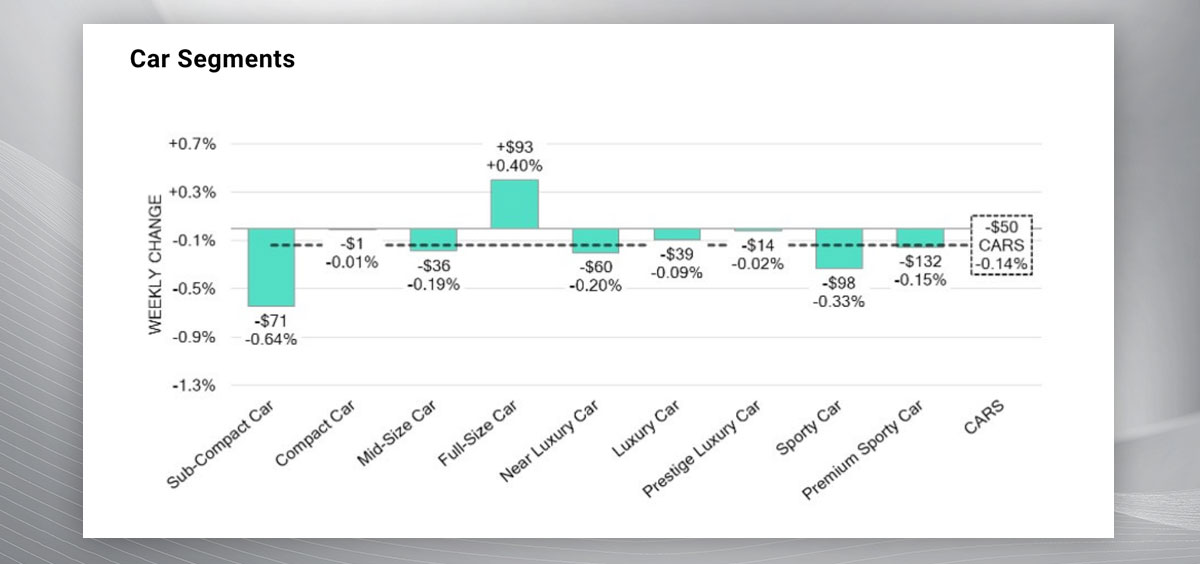 Car segment prices decreased by -0.14% (compared to -0.23 the previous week), while the truck/SUV segments were down by -0.21% (compared to -0.22 a week earlier). The largest decline in the car segments came from sub-compact cars. For trucks/SUVs, it was sub-compact luxury crossovers/SUVs.