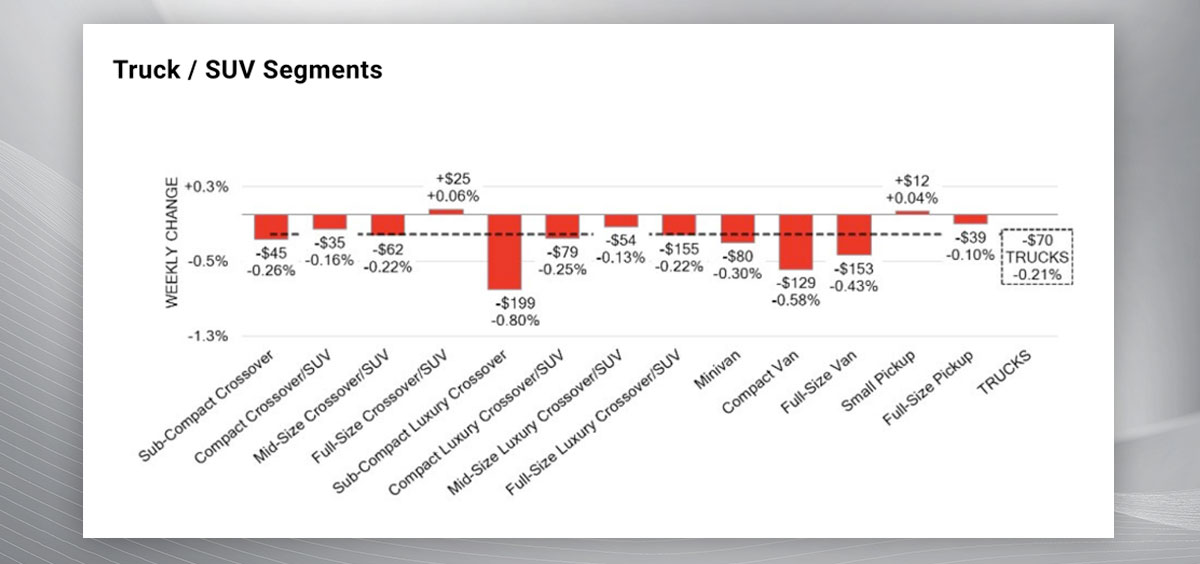 For trucks/SUVs, segments with the largest declines were sub-compact luxury crossovers (-0.80%), compact vans (-0.58%), full-size vans (-0.43%), and minivans (-0.30%). Full-size crossovers/SUVs (+0.06%) and small pickups managed an increase (+0.04%).